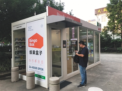 這(zhè)是(shì)一(yī)家(jiā)名為(wèi)缤果盒子(zǐ)的(de)無人(rén)便利店(diàn),在距離(lí₹)它身(shēn)旁的(de)寫字樓,入駐著(zhe)多(duō)家(jiā)互聯網公司,這(zhè)裡(lǐ)的(de)上(shàng)班族們,走出樓門(mén)數π(shù)步即可(kě)購(gòu)物(wù)。